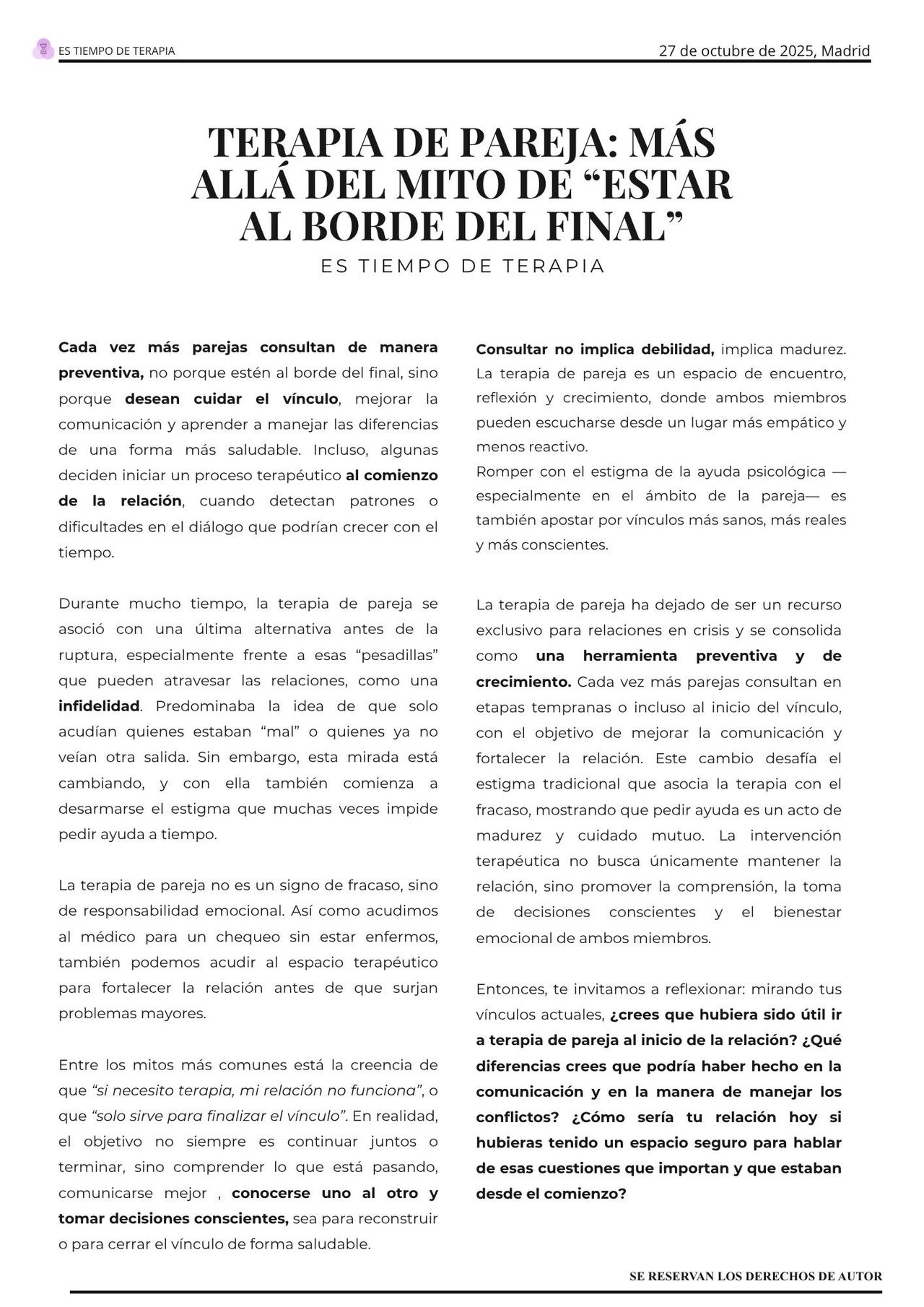 - TERAPIA DE PAREJA: MÁS ALLÁ DEL MITO DE "ESTAR AL BORDE DEL FINAL" - (Es Tiempo de Terapia, 2025)
